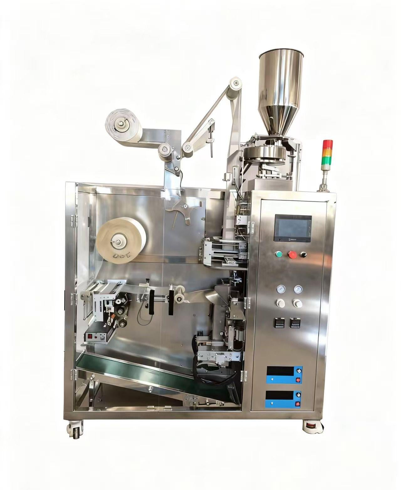 This Kunbupack One-stop nitrogen-filled fresh-keeping tea bag packaging machine is full-Automatic Tea Inner and Outer Bag Vertical Machine completes triangular bag (flat bag) making, filling, thread and tag attachment and outer bag packaging in one go. Integrated with nitrogen-filled fresh-keeping function, it greatly improves tea quality and shelf life, creating a high-end brand image.