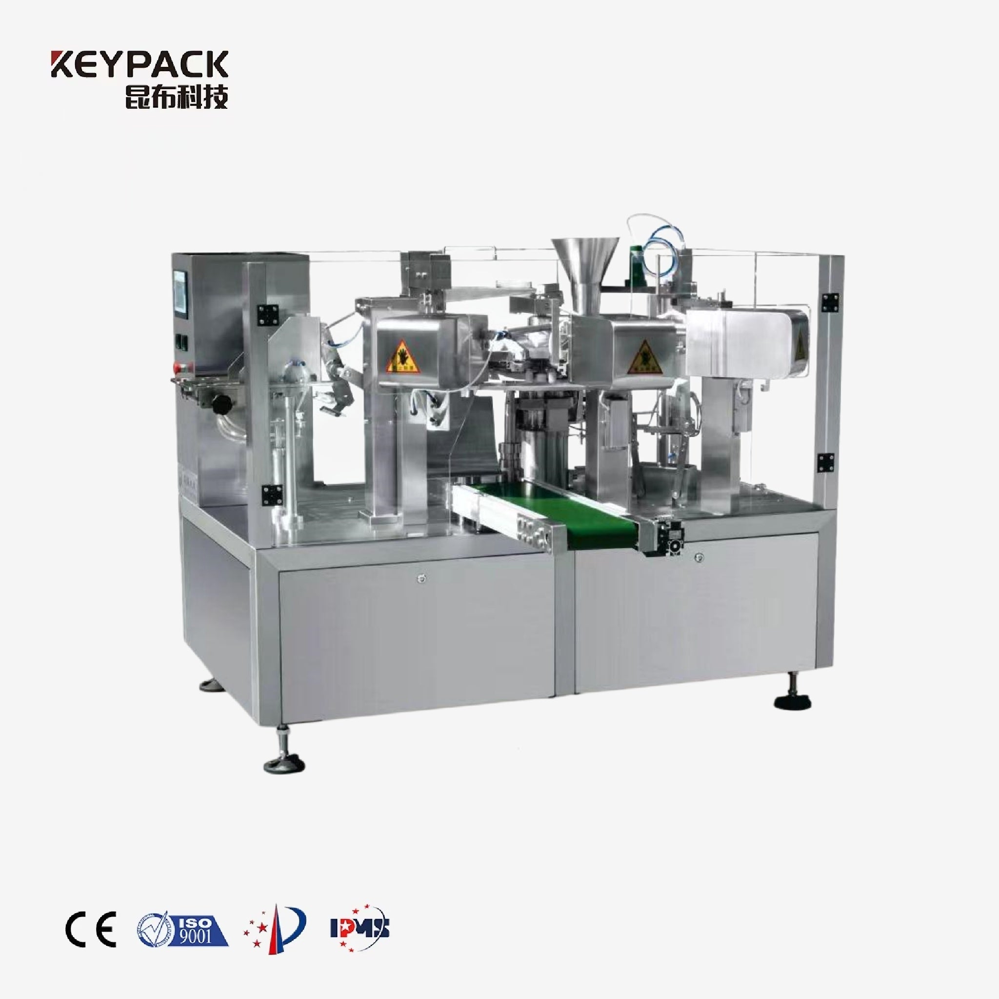 The Keypack Intelligent (Kunbupack) KL8-200 Pre-made Bag Filling Machine is an 8-station automatic pre-formed bag packager featuring advanced weighing technology and dust-proof design. This cup filling weighing machine integrates seamlessly with multi-head weighers to form complete automated packaging lines for bags ranging from 80-200mm in width. The machine supports stand-up pouches, handheld bags, four-side seal bags, three-side seal bags, paper bags, and composite bags, making it a versatile solution for food packaging machinery, snack packaging equipment, and pet food packaging machine applications.